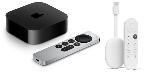 Apple- eller Google TV kommer begge med en fjernbetjening. Vælger du et af dem som udstyr, slipper du for at finde og aktivere dét, du gerne vil se fra en lille skærm. Alternativt kan du leje en YouSee tv-boks, eller en YouSee Streamer, hvor der også følger en fjernbetjening med. Lejer du udstyret fra YouSee, slipper du for at skulle betale flere hundrede kr. for udstyr, som kun holder så længe, det nu kan opdateres. Når du har installeret/opsat dit udstyr, henter du bare streamingtjenesternes apps i enten App Store eller Google Play, logger ind og finder det indhold, du vil se.